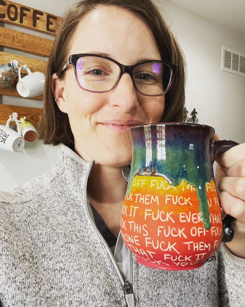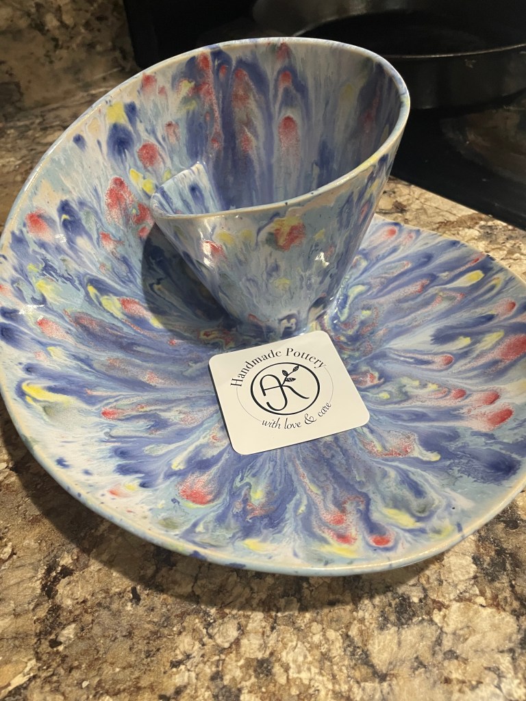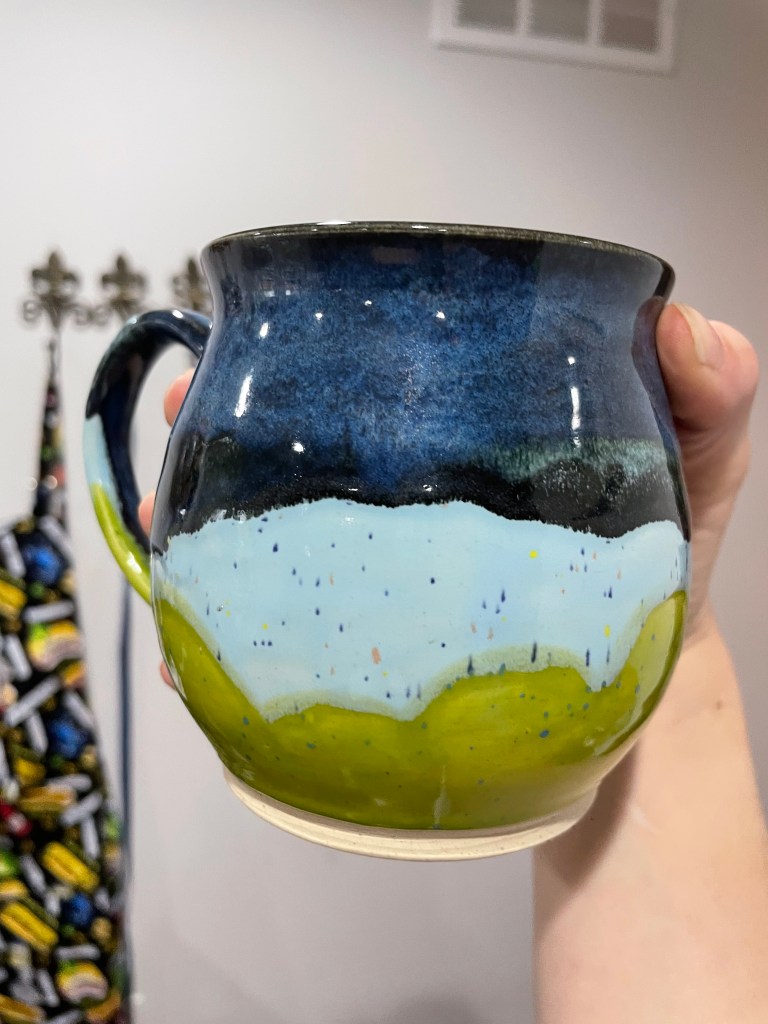 This mug caught my eye because of the intricate work to make it look “suspended” but also it’s my favorite (Tulane) colors-green and blue! Sarah German Ceramics is the artist, you can check her out at https://www.sarahgermanceramics.com/With my new endeavor into plants, which happened by accident as I’ve had this aloe plant for almost a year now and it hasn’t died, I decided to give it a cute new pot made by Aleisha Ceramics. You can check out her work at https://www.aleishaceramics.com/I love a good large mug and I picked up this one up from a local artist at the Wine Festival during Apple Blossom Festival this year. You can check her work out at https://www.instagram.com/erikamarieceramics/I am so pleased to add this bowl to my collection that came all the way from the UK! What a unique idea to have a built in spot for dips. You can check out the artist at https://annalovespottery.com/And this is definitely my most prized possession, my rainbow F*** it mug! I am a self-proclaimed “adult who loves rainbows” so a lot of my mugs are rainbow-colored. I also have a crass sense of humor sometimes. Being able to get one of these mugs was such an intense process and I’m not afraid to say a few tears might have been shed. You can check out the artist at https://www.instagram.com/l.c.ceramics/