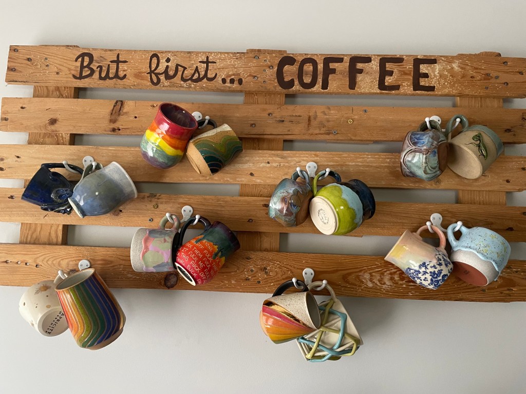 This is my prized mug collection! My husband, Joe, built this mug holder and my collection has now expanded beyond the number of hooks I have to display them here!. I’m looking into more ways to display my favorite mugs now!